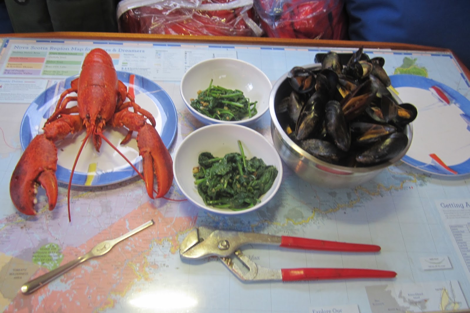 every one was steamed and open and ready to devour ... lobster, mussels and sautéed spinach in garlic .. fantastic supper